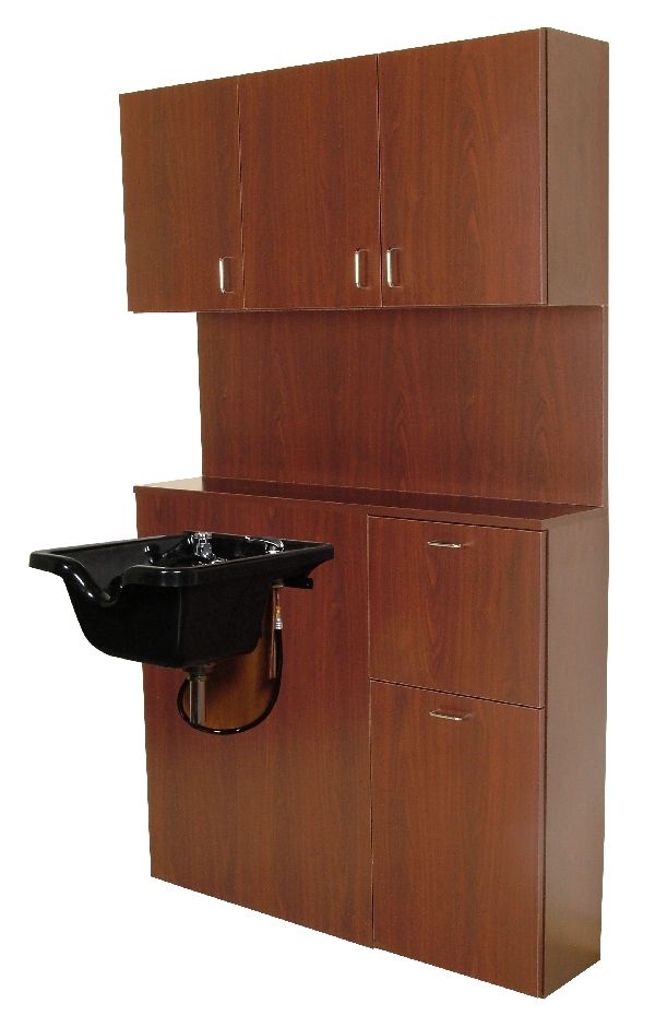 The pictured 8300 ABS bowl is (sold separately), or will accommodate any standard side-wash shampoo bowl. HP laminate on horizontal work-surface, front bowl-mounting surface, tilt-out doors; remainder is thermally-fused mill-laminated material.